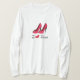 A camisa caracteriza um par de estiletes vermelhos com um arco do impressão do leopardo no dedo do pé e no fraseio: Mim calçados do coração.