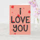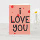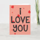 Você pode personalizar este cartão que nós projetamos com corações e círculos vermelhos e o texto Eu Amo Você.