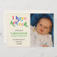 Eu cheguei! Cartas coloridas divertidas anunciando o nascimento do seu novo bebê e apresentando sua foto favorita do seu novo bebê! Personalize esta design com a sua fotografia, o primeiro, o meio e o sobrenome do bebê, a data de nascimento, a hora, o peso e o comprimento.