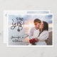 Anuncie seu noivado com este cartão de anúncio divertido e moderno. A frente do cartão é personalizável com uma de suas fotos favoritas e seus nomes e tem uma legenda de cobertura de tendências que diz "Eu disse sim" decorada com um anel de noivado bonito. Personalize a parte de trás deste anúncio com uma segunda foto, seu texto e um Código QR prático para manter seus convidados atualizados com todos os detalhes do seu casamento.