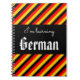 Características deste design do caderno um teste padrão das listras pretas, vermelhas e amarelas, inspiradas pelas cores da bandeira nacional alemão. Igualmente caracteriza a mensagem, "mim está aprendendo o alemão". Poderia ser usada para gravar notas, vocabulário, frases, e a outra informação útil ao aprender o idioma alemão.