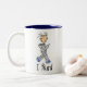 Uma figura da vara da menina vestida no terno da corrida funciona e o texto lê-me "funciona" em uma caneca customizável do tema da malhação.