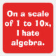 Estes I odeio adesivos de álgebra são para pessoas que adoram álgebra. Ha! Só estou brincando. Isso seria bobo! Não, é para 99yx% de nós que não entendem o que as cartas estão fazendo em matemática. O design do autocolante apresenta um fundo vermelho vibrante e um escrevendo branco e ousado que diz, "Numa escala de 1 a 10, eu odeio álgebra." Cartas em matemática. De quem foi essa ideia brilhante?