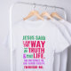 A camiseta cristã com o verso bíblico de João 14:6 Jesus lhe disse, "Eu sou o caminho, a verdade, e a vida. Ninguém pode vir ao Pai exceto por mim". Os versos estão em cor laranja vermelha e rosada e em caligrafia mista e tipografia minimalista. Esta moda, design de fé moderna é a dádiva perfeita e a declaração de moda. #cristão #religião #escritura #fé #bíblia #jesus