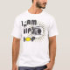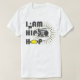 Esta camisa contem o provérbio "que eu sou HIP-HOP" com uma imagem de uma imagem do rádio da velha escola de um smiley.