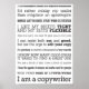 Um manifesto para redatores. Obtenha um para seu escritório freelance, estúdio ou sala para lembrar a todos o que significa ser um redator. Também faz um presente excelente para o redator em sua vida. Leituras de texto: Eu amo palavras maravilhosas e parágrafos perfeitos que eu preferencialmente enganar minha carteira do que colocar errado um apóstrofo da esquerda ou direita, cada palavra se justifica Eu gosto das minhas malas apertadas e dos meus trajes flexíveis Dê-me apenas um minuto e eu vou te dar o mínimo que eu posso resistir a ambos s*x e ganância, mas não o desejo de editar sua cópia Nenhuma foto vale um milhar de minhas palavras boas ideias são necessárias para encontrar um excelente Você vê um bloco de texto, eu vejo um bloco de mármore que conheço o oposto do antônimo e outra palavra para sinônimo O que eu quero mais é menos palavras Eu sou um redator