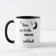 Esta palavra adorável da caneca eu te amo à lua e à parte traseira no preto com estrelas pretas e uma lua.