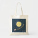 Uma sacola com um navio pequeno do foguete que circunde a lua bonito, saindo atrás de uma fuga do laço do coração. As estrelas e os pontos decoram o fundo azul do espaço da textura. O texto lê "eu te amo à lua e a parte traseira" é parte do design e nao editável. Personalize com o pouco seu nome para fazer um presente especial para a criança.