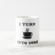 Uma caneca branca clássica com uma imagem de um copo de café e os textos "que EU TRANSFORMO" acima e "NO CÓDIGO" abaixo do copo. Mostre o que você precisa de ser produtivo como um codificador.