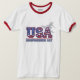 Um surfista dirige a onda dos EUA com a bandeira americana para celebrar o Dia da Independência.