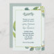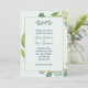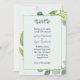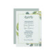 Convite para uma cerimônia de casamento com folhas botânicas design. O papel é azul-esverdeado pálido com fundo de coroa grande e aparência em camadas. Um painel esbranquiçado contém os modelos de texto em azul escuro. O texto do convite de exemplo começa com "O prazer de sua empresa é solicitado no casamento de". Os nomes também estão em script manuscrito, mas são maiores que o texto do convite. A data, hora e local, juntamente com as informações de recepção, são adicionados em um parágrafo onde você pode adicionar ou remover espaços facilmente para ajustado do texto. Um solteiro de eucalipto de cinza azul decora a parte superior do painel. A parte de trás do cartão tem um padrão leve de folhas. Mostrado em uma nave quente, papel texturizado, com outras seleções.