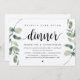Cartão de convite temático de eucalipto verde rústico moderno, com escrita preta e kraft (com título do cartão: Jantar Feliz para Sempre). É perfeito para o seu almoço de casamento íntimo / festa de celebração pós-casamento. Adicione seus detalhes em fonte / letra preta correspondente.