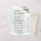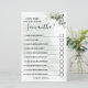 Conhece bem a noiva? Jogos das versões inglesa e espanhola incluídos (frente e verso). Mude Bride para Name (Nome) no modelo para as versões em inglês e espanhol. Para mais personalização (pergunta de alteração e outra redação, cor da fonte, estilo da fonte ), clique em personalizar, role para baixo e clique no link "clique para personalizar ainda mais". COMO JOGAR: Os convidados respondem perguntas sobre a noiva, depois de preencher todas as suas respostas, a noiva responderá a todas as perguntas e os convidados verificarão as caixas certas que eles pensam corretamente e escreverão o total de respostas corretas no final. A pessoa com as respostas mais corretas ganha.