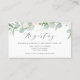 Cartão de registro branco e elegante. Apresenta ilustrações de aquarelas de folhas de eucalipto e flores brancas com um padrão botânico correspondente. Personalize adicionando nomes, nomes de armazenamento e outros detalhes. Este cartão de registro verde será perfeito para casamentos, chás de panela, chás de fraldas e outros eventos.