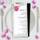 Este cartão de cardápio de casamento projetado para uma celebração amigável apresenta um belo ramo de eucalipto adornado com delicadas rosas rosa, flores brancas e folhas verdes macios. Ao redor do cartão há uma fina borda preta que adiciona um toque de elegância. A palavra "MENU", juntamente com os nomes dos casais, é apresentada numa letra decorativa na moda, fazer que se destaque. No verso, a placa é um preto sólido, fornecendo um contraste impressionante com o design frontal.