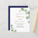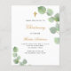 Um fundo branco decorado com verde de eucalipto e uma cruz de ouro. Personalize e o nome e os detalhes da cerimônia. Letras pretas e ouros coloridas. Fundo: fundo azul marinho.