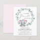 Uma menina bonitinha e econômica fez um convite com "A Sweet Little Peanut Is On Her Way" escrito em uma mistura de tipografia moderna e um roteiro de na moda com um inchaço cardíaco, e uma aquarela de um elefante bebê rosa pastel em uma coroa de verde eucalipto.