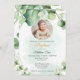 Este belo batismo ou convite batizante apresenta um fundo natural com eucalipto verde e uma cruz de ouro no centro. A parte de trás da carta é o eucalipto verde.