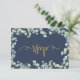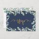 Esta placa RSVP de casamento chic apresenta uma bela cor d'água, folhagem eucalipto e tipografia de pincel de folha de ouro. Projetado para combinar com a nossa coleção de casamento Silver Eucalyptus. Personalize-o com seus detalhes de forma fácil e rápida, basta pressionar o botão personalizar para reorganizar e formatar o estilo e a colocação do texto.