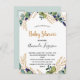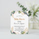 Para um Chá de fraldas. Um fundo branco chic. Decorados com eucalipto verde e ouro, folhagem. Personalize e adicione um nome e detalhes da parte. Letras pretas e ouros. O texto: Chá de fraldas e o nome da mãe a ser é escrito com um moderno estilo escrito à mão. Verso: cor verde de fundo, design postal. Dica: Se você não quiser que pareça um cartão postal, clique em personalizar, vá para o verso e remova o divisor e o carimbo de posto.