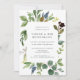 As madrinhas botânicas elegantes lançam ou lançam quadros de convite para o almoço com detalhes de seu evento com uma borda de folhas de cor d'água, flores azuis e folhagem verde. Convites inverso a marinho enfumaçado sólido azul.