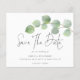 O Casamento De Eucalipto Verde Moderno Salva A Data. Um alternativo MENOR de 4,5" x 5,6", compatível com o orçamento. Disponível em um STOCK de PLACA SEMI GLOSS 110 lb ou um STOCK de PAPEL THINNER SATIN FINISH 80 lb. Os envelopes são um extra opcional. Uma tipografia de na moda set em preto para Salvar a Data complementando o resto do texto que você pode personalizar facilmente, com um galho de elegantes folhas de aquarela eucalipto acima. Na parte de trás está uma sombra coordenada de verde que pode ser mudada para outra cor se você desejar através da opção Personalizar mais.
