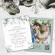 Convite de casamento multifuncional, acessível ao orçamento, com aquarelas de verde sage eucalipto verde verde verde, na moda e tipografia de cinza mole. No verso, adicione sua foto e insira o endereço do site de casamento para criar um código QR para seus convidados digitalizarem para RSVP on-line e obter detalhes adicionais de casamento, como instruções e acomodações.
