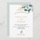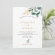 Um fundo branco decorado com verde de eucalipto e folhas de ouro. Personalize e adicione seus nomes e detalhes do casamento. Letras pretas e ouros coloridas.