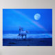 Belo tiro de fantasia de um garanhão branco correndo livre ao longo da costa sob uma lua de cheio e arco-íris. Imagem fantástica!