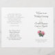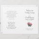 Modelo de programa de casamento dobrado com design de rosas rosa. O papel cru é mostrado, com outros tipos de papel disponíveis. Personalize o texto impresso em preto e caligrafia em quatro páginas - ambos os lados - deste papel. Dobrar após a compra para criar o programa. O texto da frente contém um título, nomes com grande e grande (e sinal), duas rosas cor-de-rosa com folhas e um lugar para a data e a localização do casamento. Dentro lista sua ordem de cerimônia e os participantes da festa de casamento. No verso do programa, é possível adicionar um verso de script e uma nota aos convidados. Escritura de exemplo é, "O amor é paciente. O amor é gentil" de 1 Corinthians.