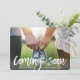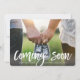Anuncie suas grandes notícias em estilo com estes anúncios de gravidez em chic apresentando sua paisagem favorita orientada ou foto vertical com uma cobertura de texto manchada branca lendo "em breve." Personalize com seu nome e data de chegada esperada.