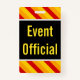 Este design de crachá de de visualização apresenta a mensagem "Event Oficial". Apresenta também listras cor de laranja, amarela e vermelha que chamam a atenção. A parte traseira apresenta um nome de evento personalizável e data(s) de evento. [~Z0000286]