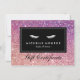Coordena-se com as Eyelashes com o Modelo de cartão de negócios Glitter Púrpura/Rosa até 1201AM. Uma imagem brilhante púrpura/rosa preenche o plano de fundo deste certificado de presente personalizável para salões de pestanas. Um par de pestanas brancas é a marca perfeita para extensões de pestanas, maquiadores, empresas cosméticas, bares de lash e muito mais. Este certificado de presente vem com um envelope branco padrão. © 1201AM CREATIVE