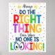 Faça a coisa certa mesmo quando ninguém está olhando! Poster para usar em sala de aula, escritório escolar, corredor escolar, sala de almoço, escritório de conselheiros escolares, escritório de aconselhamento de orientação, gabinete de terapeuta infantil, escritório de psicologia escolar, serviço de trabalho social, serviço de trabalho social escolar ou serviço de psicologia infantil. Esta poster é também excelente de usar como decoração de quarto de escola adolescente ou de escola secundária e como arte motivacional em salas de aula de todas as idades! Torna o excelente inspirador e provocador de pensamentos em arte. Um gráfico excelente, colorido e atraente que captará a atenção da criança e a lembrará de fazer sempre a coisa certa! Uma forma excelente de promover ética e lembretes anti-bully em uma sala de aula ou escola.