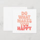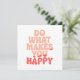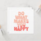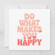Dê mais atenção ao dia de alguém com este cartão de saudação alegre e eloquente com a inspiradora frase "Faça o que te faz feliz" em letras vibrantes e coloridas. Quer você esteja dando a um amigo ou usando-o como um lembrete diário para liderar com bondade, este design transmite uma mensagem de encorajamento, alegria e boas vibrações.