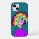 Design colorido, brilhante e abstrato de uma face estilizada de uma menina de cabelo listrado, com um fundo de estrelas.