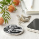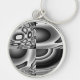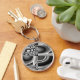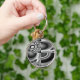 Este chaveiro apresenta um padrão preto e branco que pode se parecer com muitas formas e formas, mas toda a imagem se parece com um mau com olhos escuros encarados e um sorriso largo.
