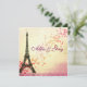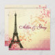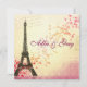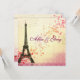 modelo de convite à torre Eiffel, colorida, com corações flutuando ao fundo. Pode ser facilmente editado para qualquer convite de festas temático francês. Mostre seus convites em estilo!