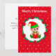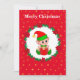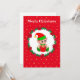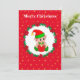Fada de Natal fofa, coroa de pinheiro, poinsettias, bolas e estrelas douradas em cartão de Natal vermelho. Todo o texto pronto para ser personalizado.