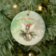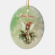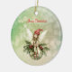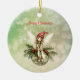 Uma fofa fada vestindo uma touca vermelha senta-se num enfeite de Natal verde decorado com folhas de azevinho e frutos enquanto flocos de neve dançam ao seu redor. As palavras “Feliz Natal” podem ser facilmente mudadas para qualquer mensagem que você preferir e o verso também pode ser personalizado.