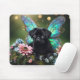 Mousepad com um doce cachorrinho preto com asas de fada num tronco com flores