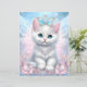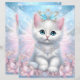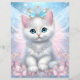 Uma adorável princesa de fada, um gatinho branco com joias, flores cor-de-rosa e asas de fada sobre um fundo azul cintilante.