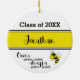 Segundo grau de Fairview junto com mascote escolar, a jaqueta amarela, de um lado. Classe 20XX, nome do estudante, e "uma vez jaqueta amarela, sempre jaqueta amarela!" do outro lado. Tudo nas cores da escola de amarelo, preto e branco.