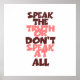 Expresse seu sentimento com um poster que diz "Fale a Verdade ou Não fale De Forma Alguma" Tipo de Papel: Papel Poster (Semibrilho) Suas paredes são reflexo da sua personalidade, então deixe-os falar com suas citações favoritas, arte ou designs impressas em nossos posters Giclee personalizados! Escolha entre até 5 tipos de papel exclusivos e de alta qualidade para atender às suas necessidades criativas ou comerciais. Todas são opções de excelente que apresentam uma superfície lisa e sem ácido com impressão a cores de cheio vibrante. Usando tintas à base de pigmento (preferencialmente que tintas à base de corantes), suas fotos e trabalho de arte serão impressas na resolução mais alta, preservando todos os detalhes originais e seu espectro de cores de cheio. Navegue por posters de tamanho padrão ou personalizado e opções de enquadramento para criar arte que é uma representação perfeita de você. Impressões Giclee de qualidade de galeria Perfeito para posters de formato grande ou terminação de semivroma de sinalização Brilhante para imagens coloridas Tinta baseada em pigmento para impressão de alta resolução do espectro de cores de cheio de 53 lb., papel poster sem ácido de 7,9 pontos Disponível no dimensionamento personalizado de até 60" Opções de enquadramento personalizado disponíveis quando o poster é adicionado ao carrinho