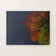 Olhando para os galhos de uma torre no outono. As folhas em queda de burgundy, vermelha, ouro, laranja, amarela e azul brilham contra o céu azul profundo.