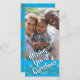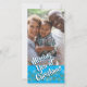 Cartões fotográficos de Natal com texto em forma de azul com flocos de neve. Adicione uma foto vertical - retrato a placas planas. O texto branco está em forma de sombra e o texto em negrito para se destacar. "Falta-te no Natal" é o texto sugerido, mas é fácil de mudar. Não deixe o seu texto chegar perto da borda do cartão ou ele pode ser cortado na impressão. O reverso também é azul com um padrão de ouro e flocos de neve esbranquiçados.