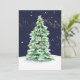 "Cartão de Fotografia da Família Simples de Árvore de Natal Elegante, Feliz Moderna." Elegantemente pintado em aquarela uma árvore de Natal iluminada e nevada com estrelas de ouro brilhando em um céu azul marinho escuro enquanto a neve cai suavemente. O design de texto da tipografia simplesmente diz, "Oh Santa Noite", fornecendo o foco simples na razão da estação. Trabalho de arte pintada por uma artista e designer internacionalmente licenciada, Audrey Jeanne Roberts, copyright.