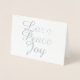 Paz, Amor e Joy em uma folha elegante de prata faz este Cartões de foto de Natal brilhar. Compartilhe suas fotos de praia da família (ou qualquer outra!) com uma reviravolta moderna mínima. O texto simples e estilizado de folha de alumínio real na frente e o cartões de natal personalizado e o dentro opcional de fotos da família serão um sucesso para seus amigos e família. Este cartão com fotos de férias é perfeito para fotos familiares de temas costeiros ou de praia. E é completamente personalizável para ajustado da sua família.