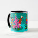 Esta família retro que apara a caneca da árvore de Natal contem cada tradição do feriado mas o fruitcake. Uma família dos desenhos animados dos anos 60 está em casa em sua sala de visitas moderna do meio século. Há uma parede de tijolo de turquesa e de cerceta e um vermelho, lareira do cone com um fogo rujir. O pai está vestindo um terno preto e um laço vermelho. Está pendurando meias verdes do Natal na chaminé da modificação com cuidado. Ao lado do pai, o júnior é empoleirado precària em uma cadeira alaranjada. Whoa! Fácil lá, júnior! Está alcançando para fora para pôr um ornamento sobre um kitchy, cor-de-rosa, a árvore de Natal que é já decked para fora com ornamento da cerceta e uma estrela amarela. No lado oposto da árvore, a mamã está guardarando um presente festiva envolvido. Hey, nenhuma agitação permitida! A mamã está vestindo um vestido vermelho brilhante do wiggle com guarnição branca. Igualmente está vestindo um chapéu do papai noel. Abaixo da árvore, há um gato preto lustroso que veste um arco vermelho. No assoalho, há um jogador gravado verde e preto cercado por álbuns coloridos do vinil. Você apenas sabe que a família está cantando junto com suas canções de natal favoritas do Natal quando forem decking os salões.