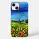 Paisagem da Toscana, cor, vibrante e expressiva beleza da flora e campos de Verão italianos em laranja amarelo vivo, verde, castanho, cor azul, lindas flores, ciprestes e oliveiras, antiga casa de fazenda rustica sob o céu azul.Pintura acrílica em canvas.